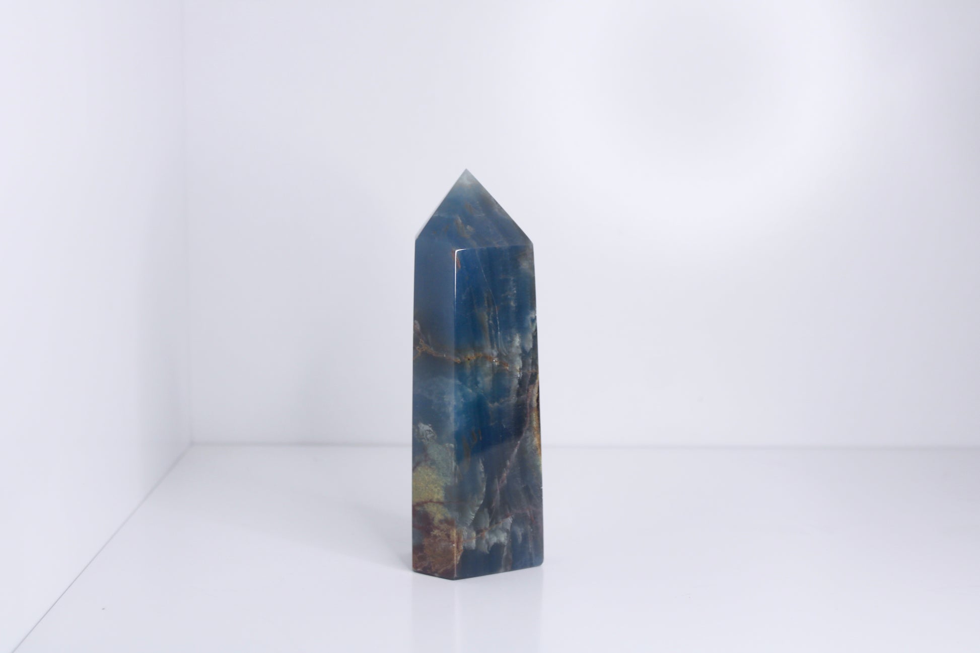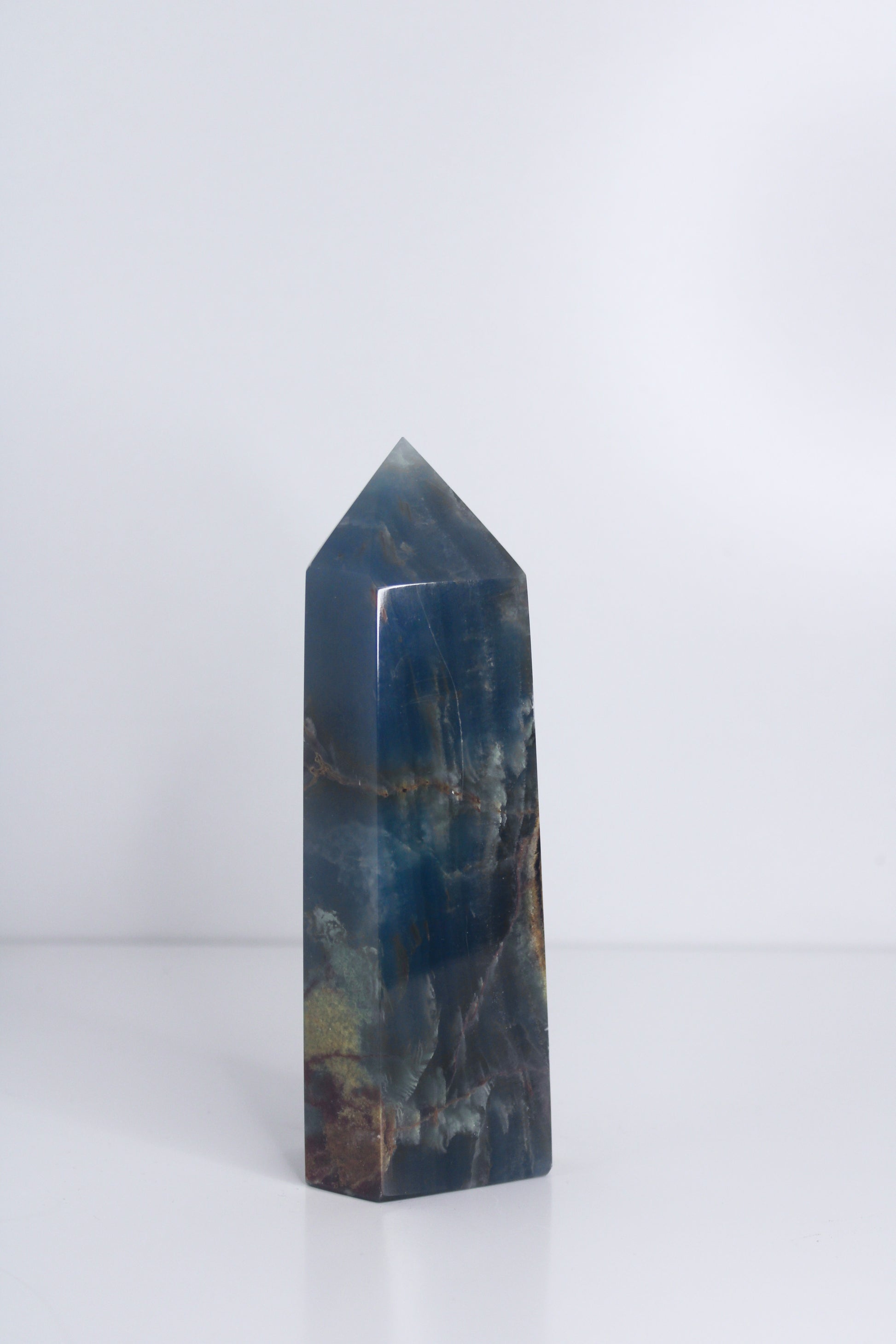 This elegant Aquatine Calcite tower from Argentina features soft blue to aqua tones with natural banding and gentle translucency. The polished tower form enhances the stone’s color gradients while maintaining a refined, architectural presence suitable for display.