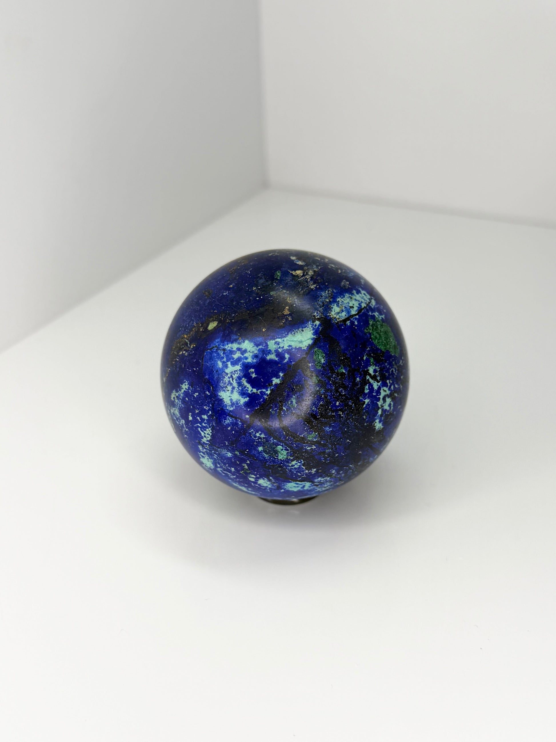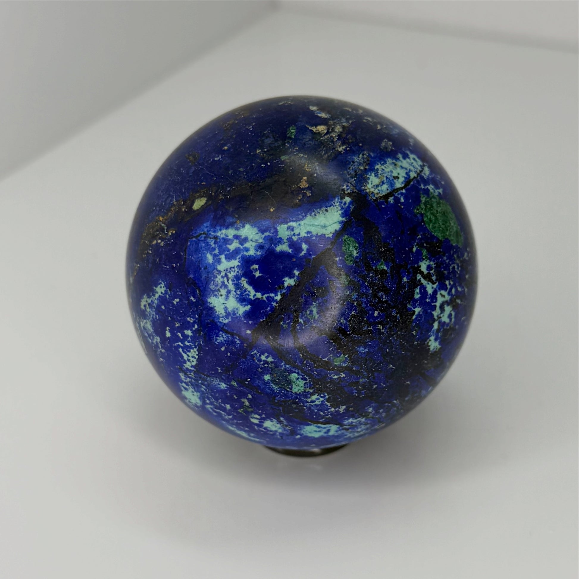 Azurite is prized for its intense blue tones and distinctive mineral character. The sphere shape allows for a balanced, all-angle display, making this piece ideal for shelves, desks, cabinets, or curated crystal collections.