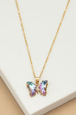 Aurora Borealis finish crystal butterfly pendant necklace. Made of glass, brass and iron.