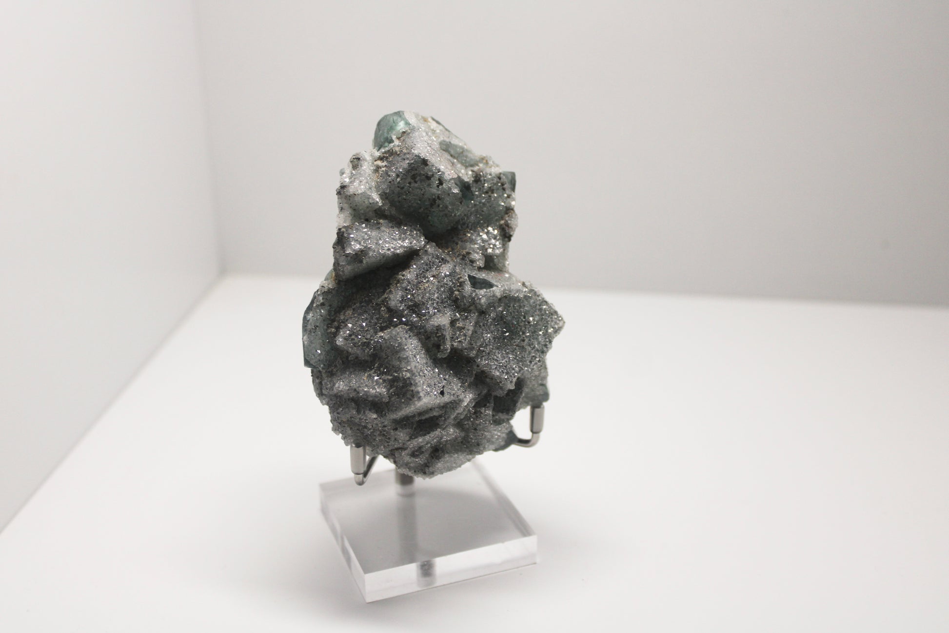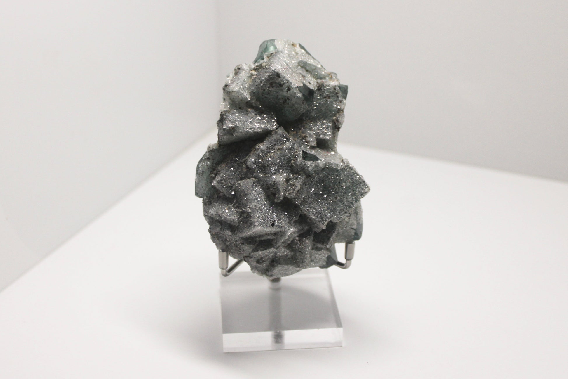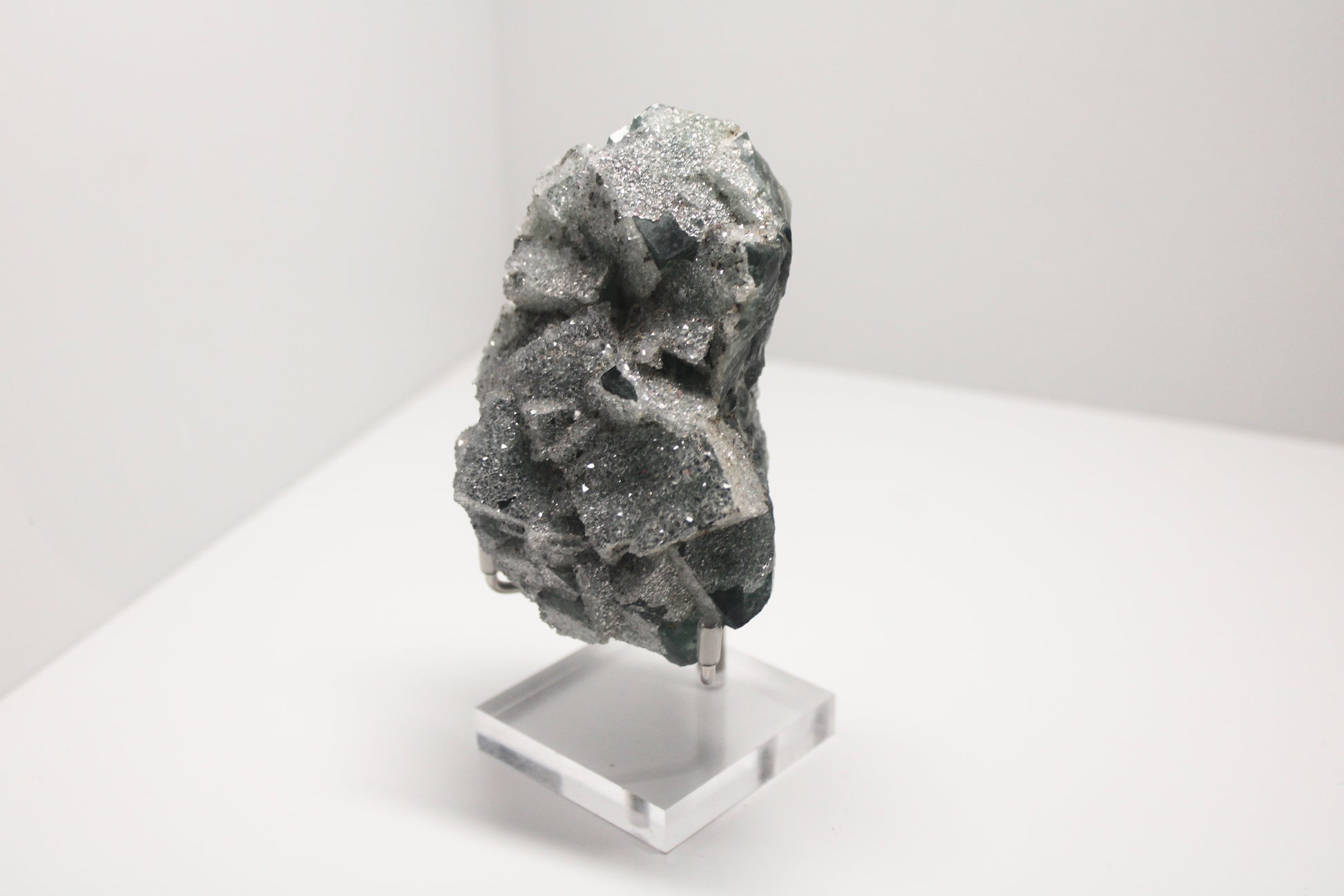 This natural Green Fluorite specimen with quartz druzy features intergrown fluorite crystals accented by a fine layer of sparkling druzy quartz. The combination of soft green fluorite and shimmering crystal coating creates strong contrast and texture, giving the piece excellent visual depth.