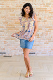 Fall in love with our Love of My Life Flutter Sleeve Top! The woven fabric and V-neckline add a touch of elegance, while the flutter cap sleeves and machine embroidered details give a charming, playful vibe. Perfect for a casual outing or a fun date night.