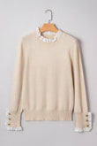 Madalyn Patchwork Cuffs Loose Sweater is designed to move with you and keep you comfortable all day long. This knit pullover sweater is perfect for casual outings. Featuring a soft knit texture with delicate lace details. Ribbed patchwork cuffs designed with gold-tone buttons. The elegant sweater pairs well with any outfit for a refined look. Material: 50%Acrylic+27%Polyester+23%Polyamide.