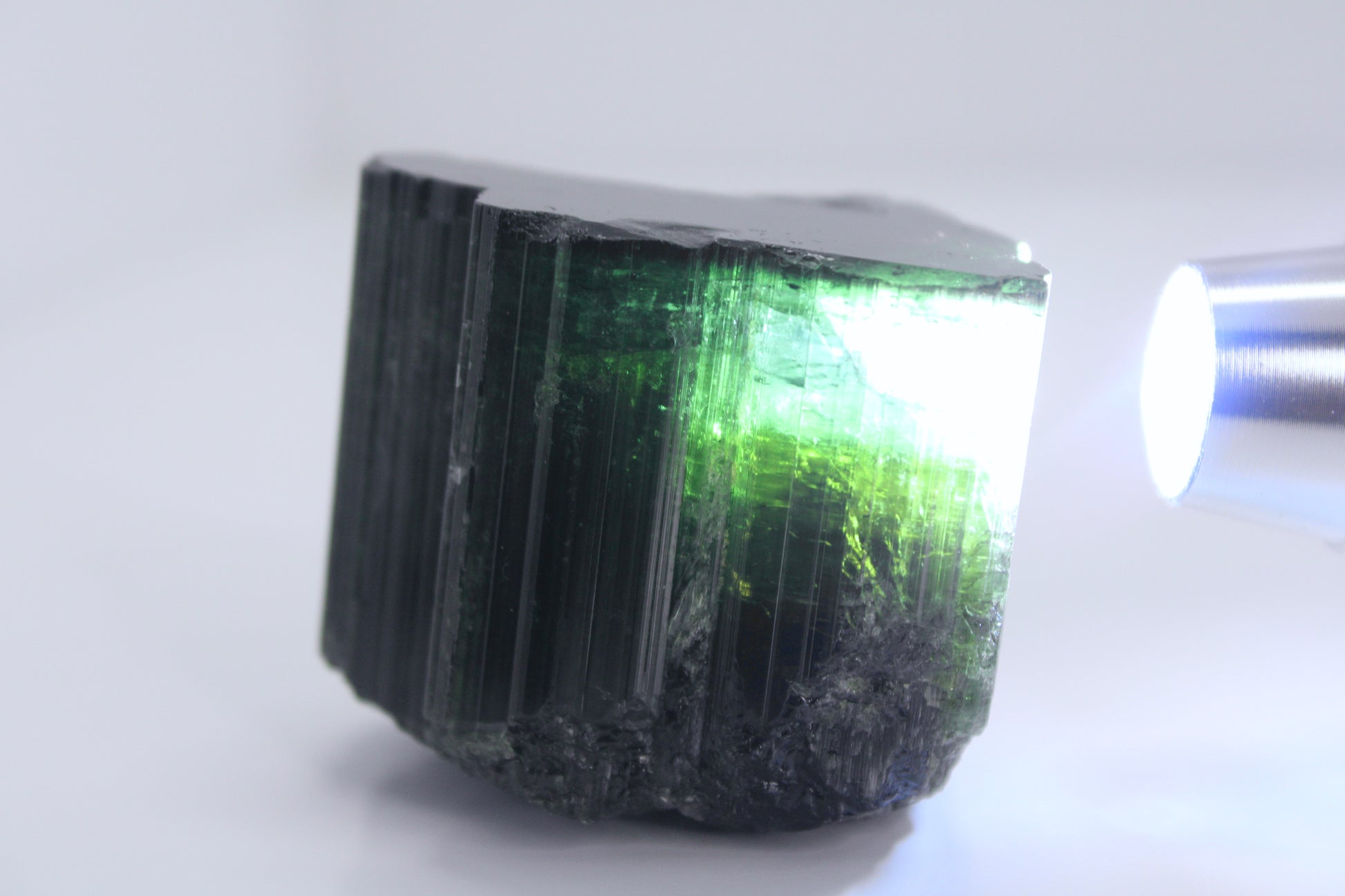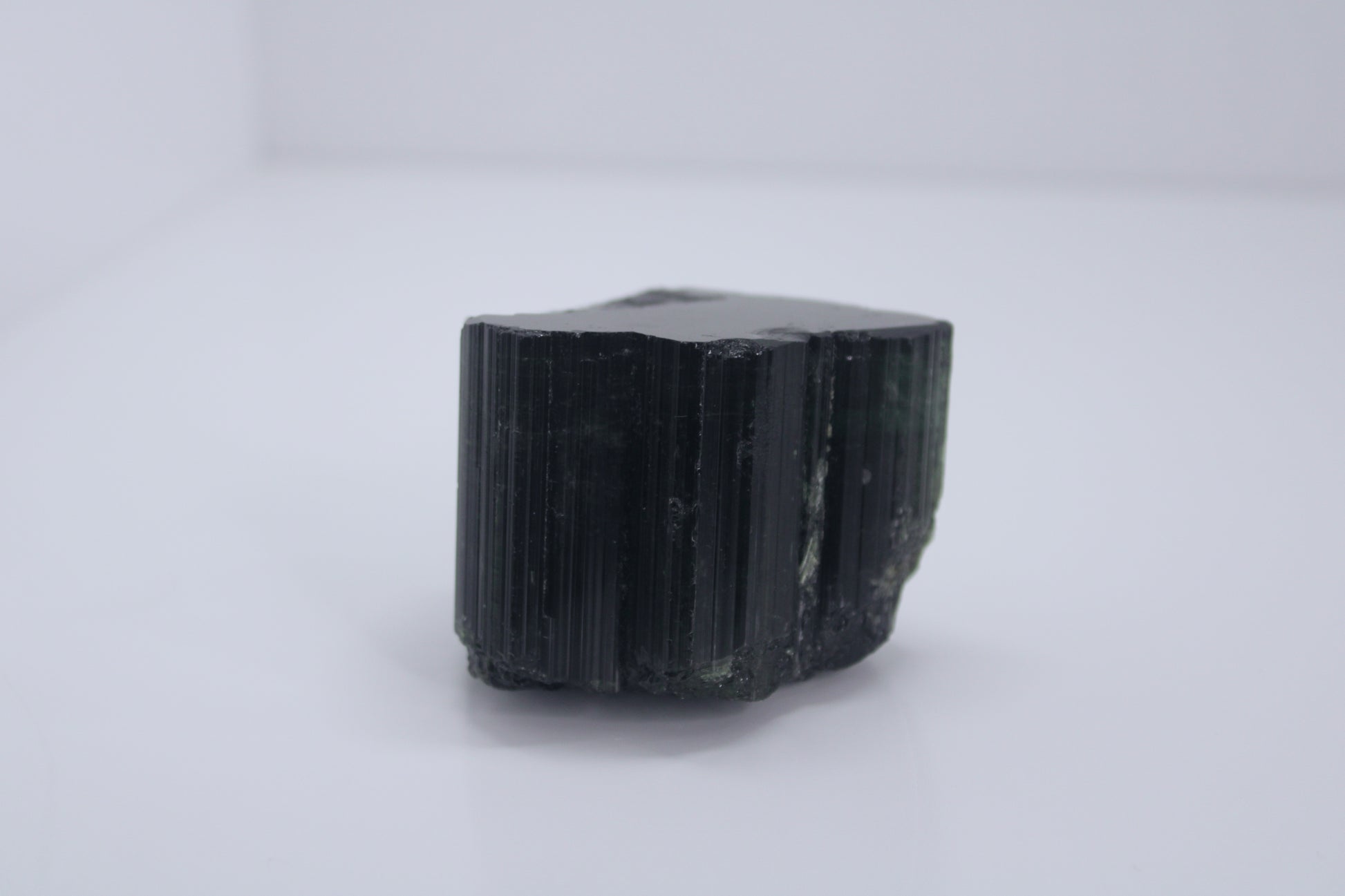 This exceptional iridescent Black–Green Tourmaline crystal from Pakistan is a striking natural specimen showcasing deep black tones with flashes of green and subtle blue iridescence under light. The strong vertical striations and dramatic flame-like growth create a bold, architectural presence rarely seen in tourmaline specimens of this quality.