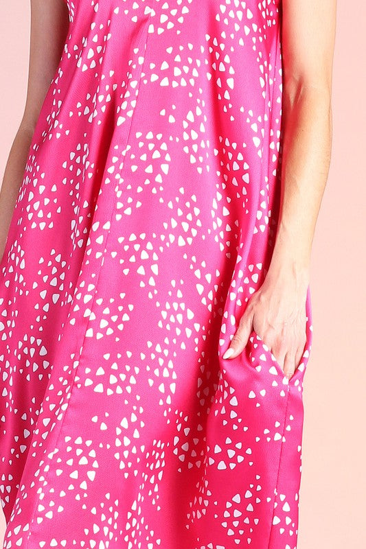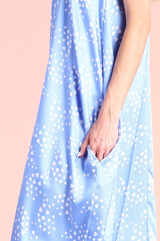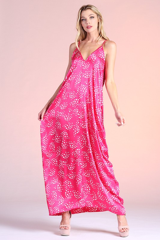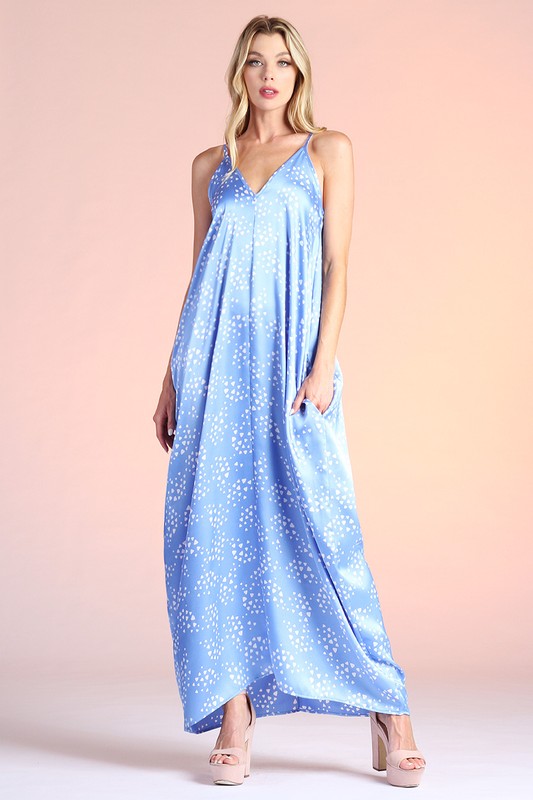 Slip into this beautiful satin maxi dress, complete with a slimming cocoon body and pockets! The v neck and backline give you room to accessories with necklaces, chokers or statement earrings.