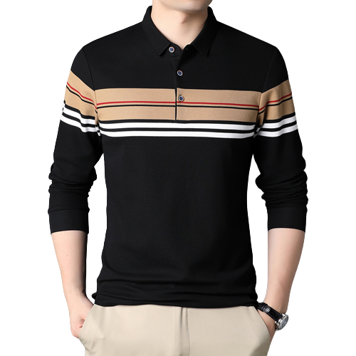 A Long-Sleeved Striped Polo Men T-Shirt is a type of casual shirt for men that combines the classic design of a polo shirt with the added coverage of long sleeves. It is made of a breathable and lightweight material such as cotton or a cotton blend. The shirt features a collared neckline, button placket, and long sleeves, and is often decorated with stripes in contrasting colors running vertically down the shirt. This type of shirt is a versatile and stylish choice for a range of casual and semi-casual occasions and can be paired with a variety of pants and shoes for a classic, preppy look.