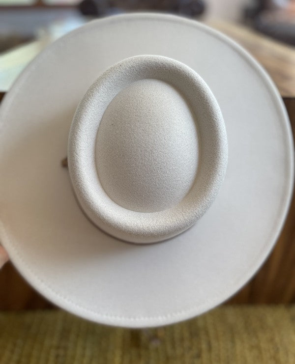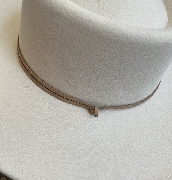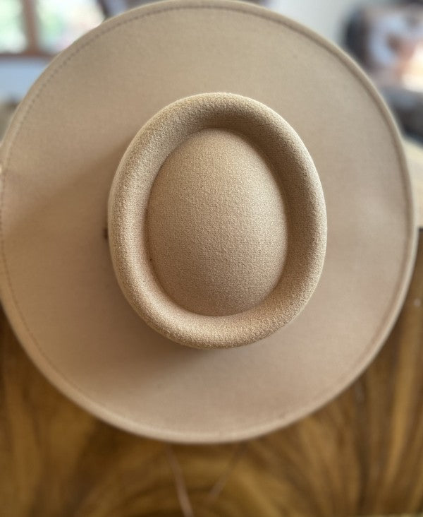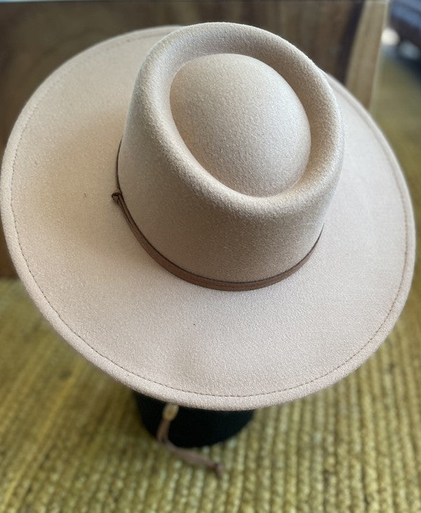 Wide brim bolero or boater hat in vegan felt with chin cord. Unisex style for men or women.